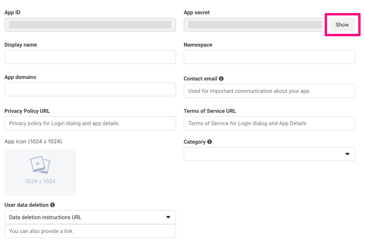 - Select Show and copy the App ID and App Secret for a later step. Keep the Facebook developer tools page open.